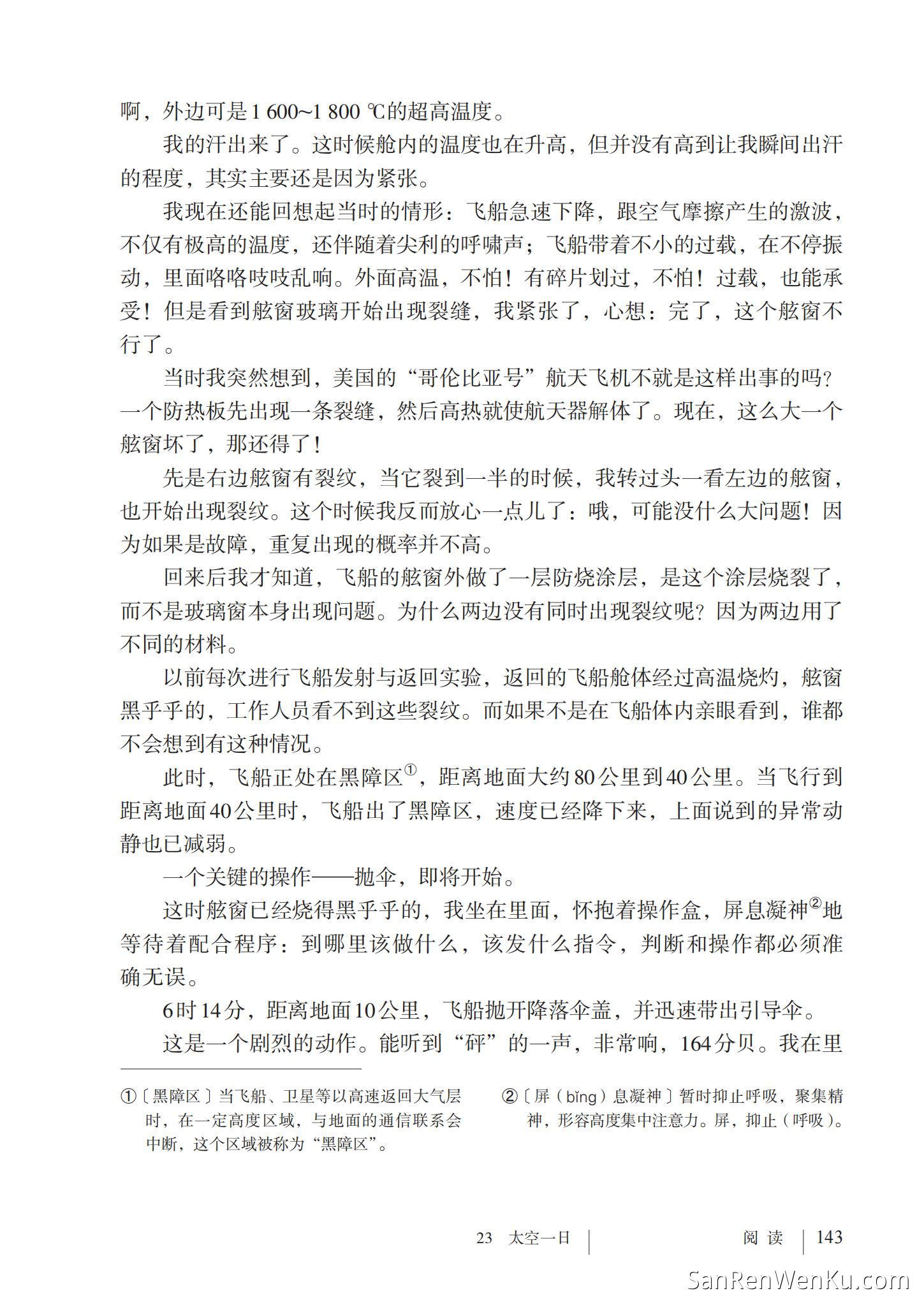 ◎ 这篇课文展现了航天员杨利伟首次太空飞行的一些经历。快速浏览课文,注意借助各部分的小标题,把握文章的主要内容。