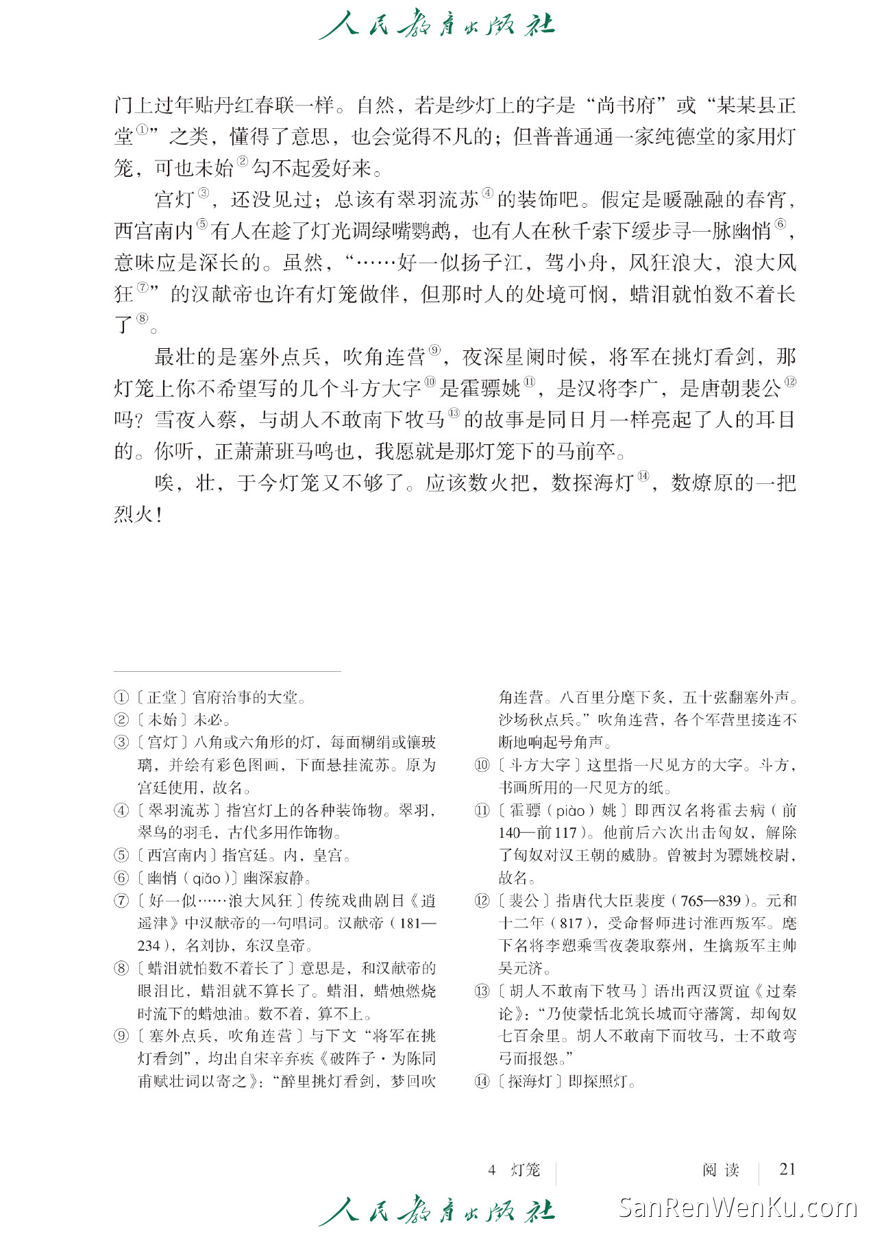 宫灯③,还没见过;总该有翠羽流苏④的装饰吧。假定是暖融融的春宵,西宫南内⑤有人在趁了灯光调绿嘴鹦鹉,也有人在秋千索下缓步寻一脉幽悄⑥,意味应是深长的。虽然,“……好一似扬子江,驾小舟,风狂浪大,浪大风狂⑦”的汉献帝也许有灯笼做伴,但那时人的处境可悯,蜡泪就怕数不着长了⑧。
