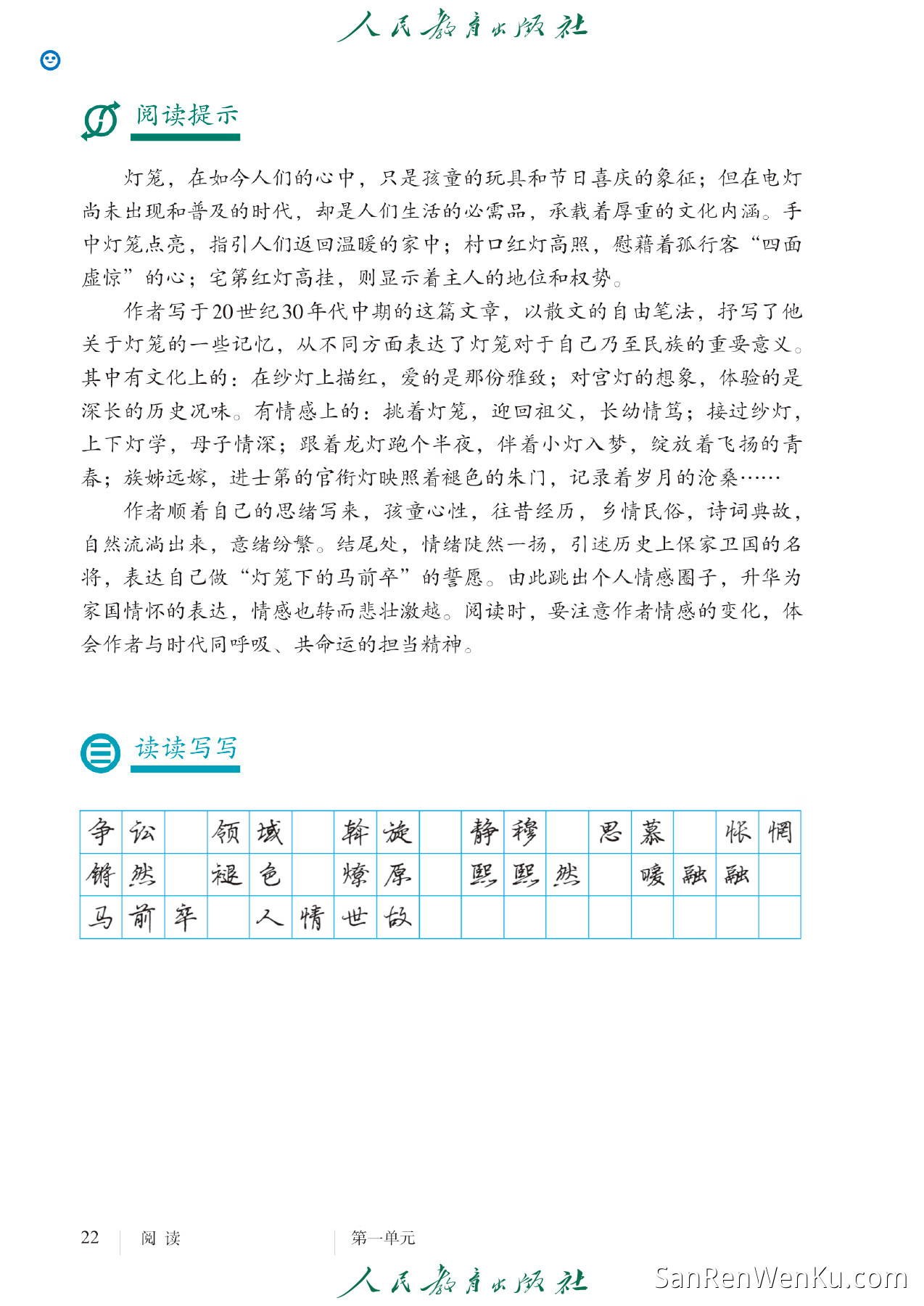 作者顺着自己的思绪写来,孩童心性,往昔经历,乡情民俗,诗词典故,自然流淌出来,意绪纷繁。结尾处,情绪陡然一扬,引述历史上保家卫国的名将,表达自己做“灯笼下的马前卒”的誓愿。由此跳出个人情感圈子,升华为家国情怀的表达,情感也转而悲壮激越。阅读时,要注意作者情感的变化,体会作者与时代同呼吸、共命运的担当精神。