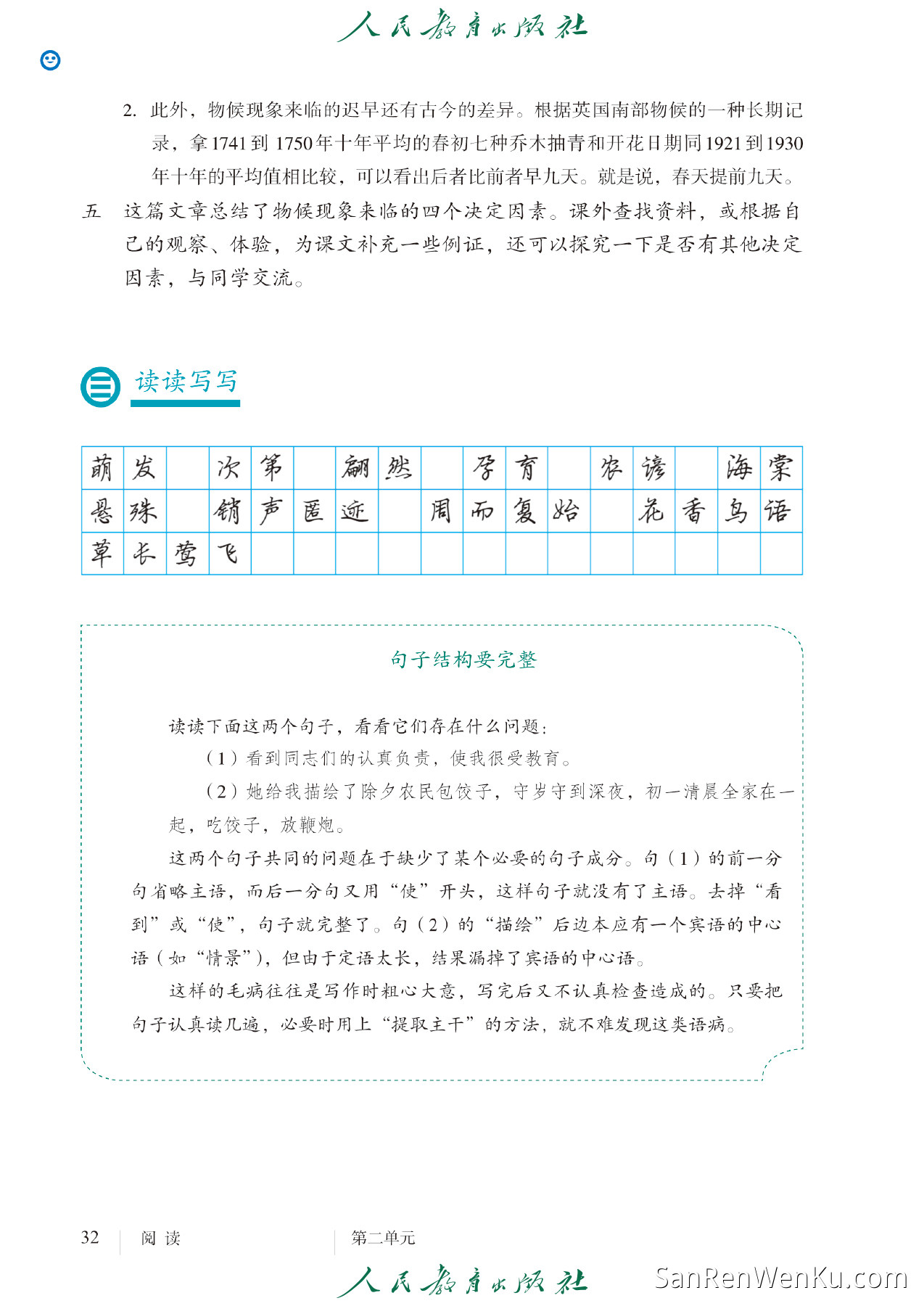 五、这篇文章总结了物候现象来临的四个决定因素。课外查找资料,或根据自己的观察、体验,为课文补充一些例证,还可以探究一下是否有其他决定因素,与同学交流。
