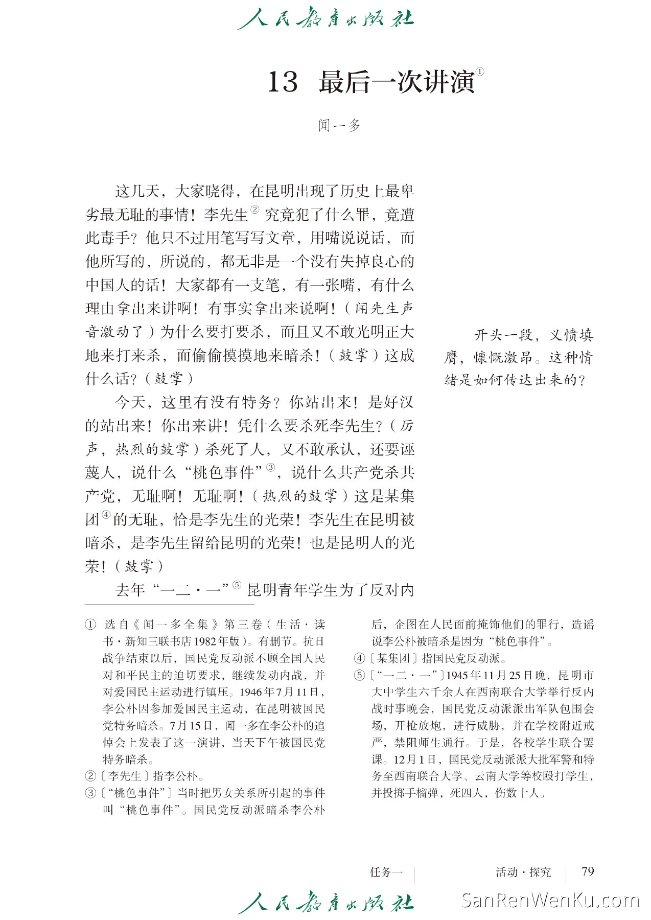 ① 选自《闻一多全集》第三卷(生活·读书·新知三联书店1982年版)。有删节。抗日战争结束以后,国民党反动派不顾全国人民对和平民主的迫切要求,继续发动内战,并对爱国民主运动进行镇压。1946年7月11日,李公朴因参加爱国民主运动,在昆明被国民党特务暗杀。7月15日,闻一多在李公朴的追悼会上发表了这一演讲,当天下午被国民党特务暗杀。
