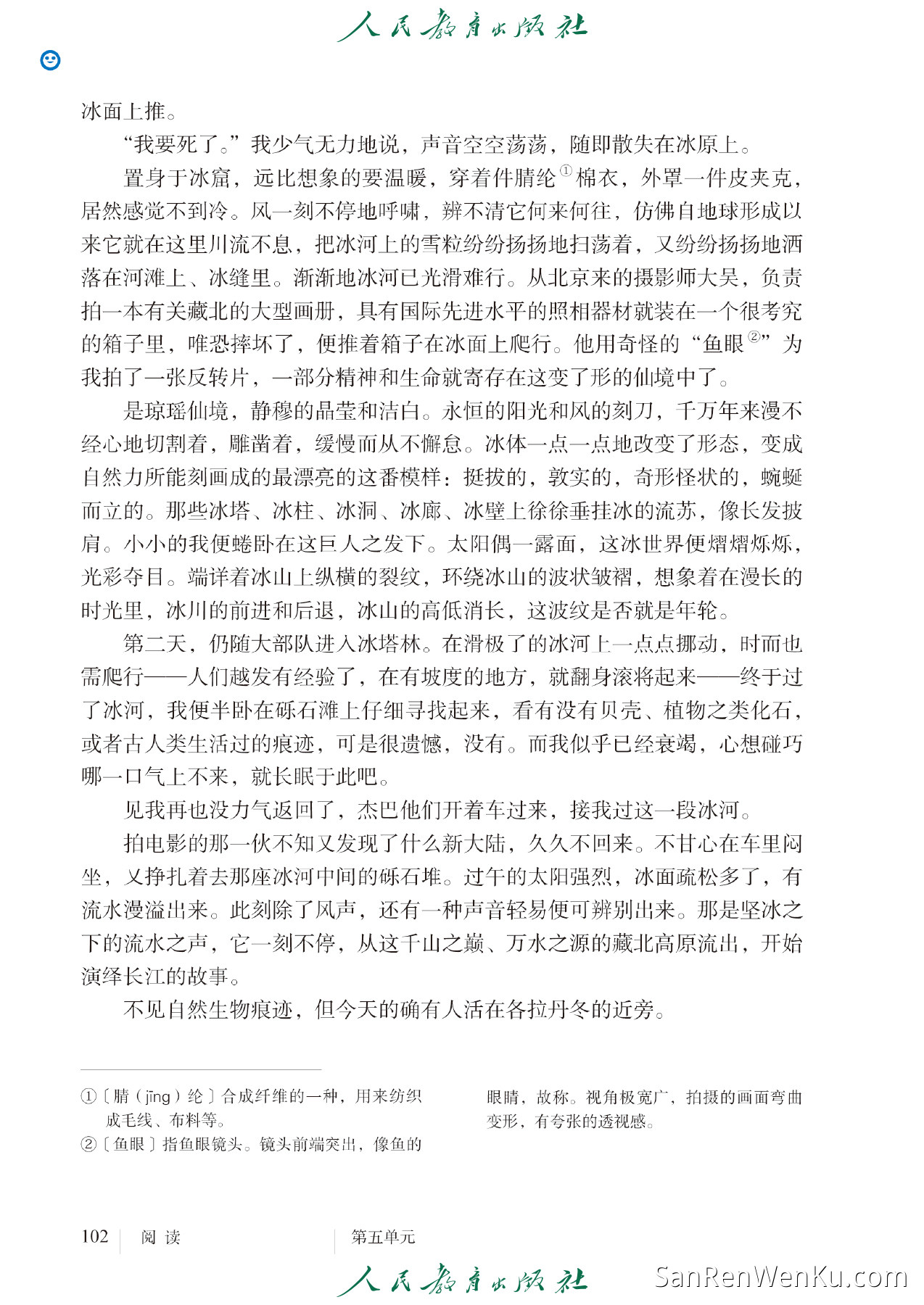 一、本文记述了作者跟随摄制组在各拉丹冬游览的经历。理清文章的脉络,复述作者在各拉丹冬的所见所感。