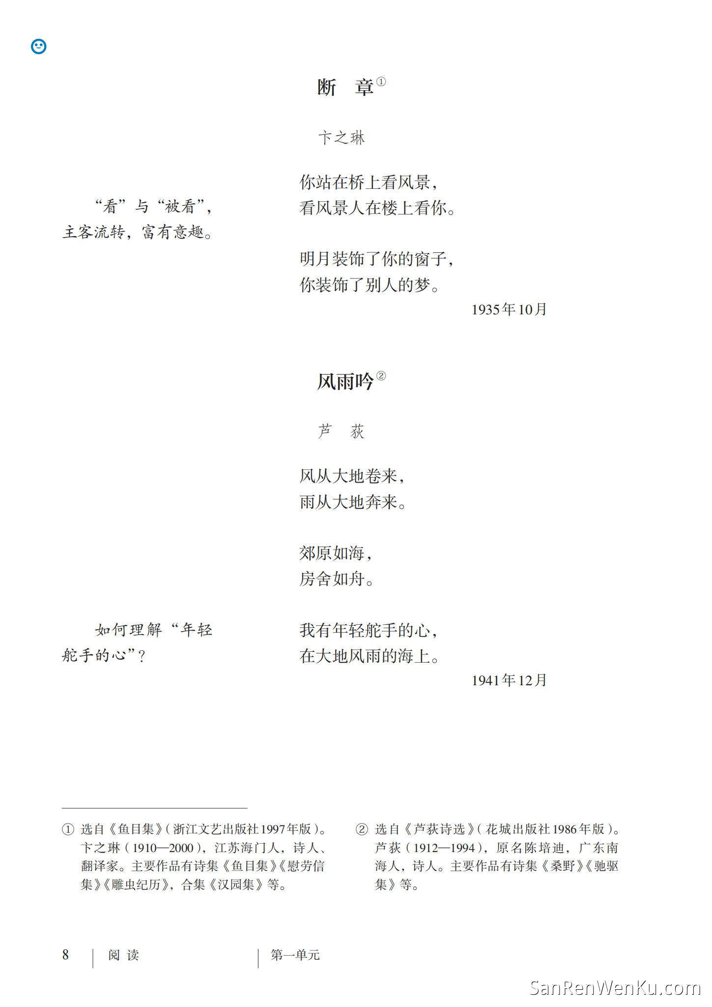 ②选自《芦荻诗选》(花城出版社1986年版)。芦荻(1912—1994),原名陈培迪,广东南海人,诗人。主要作品有诗集《桑野》《驰驱集》等。