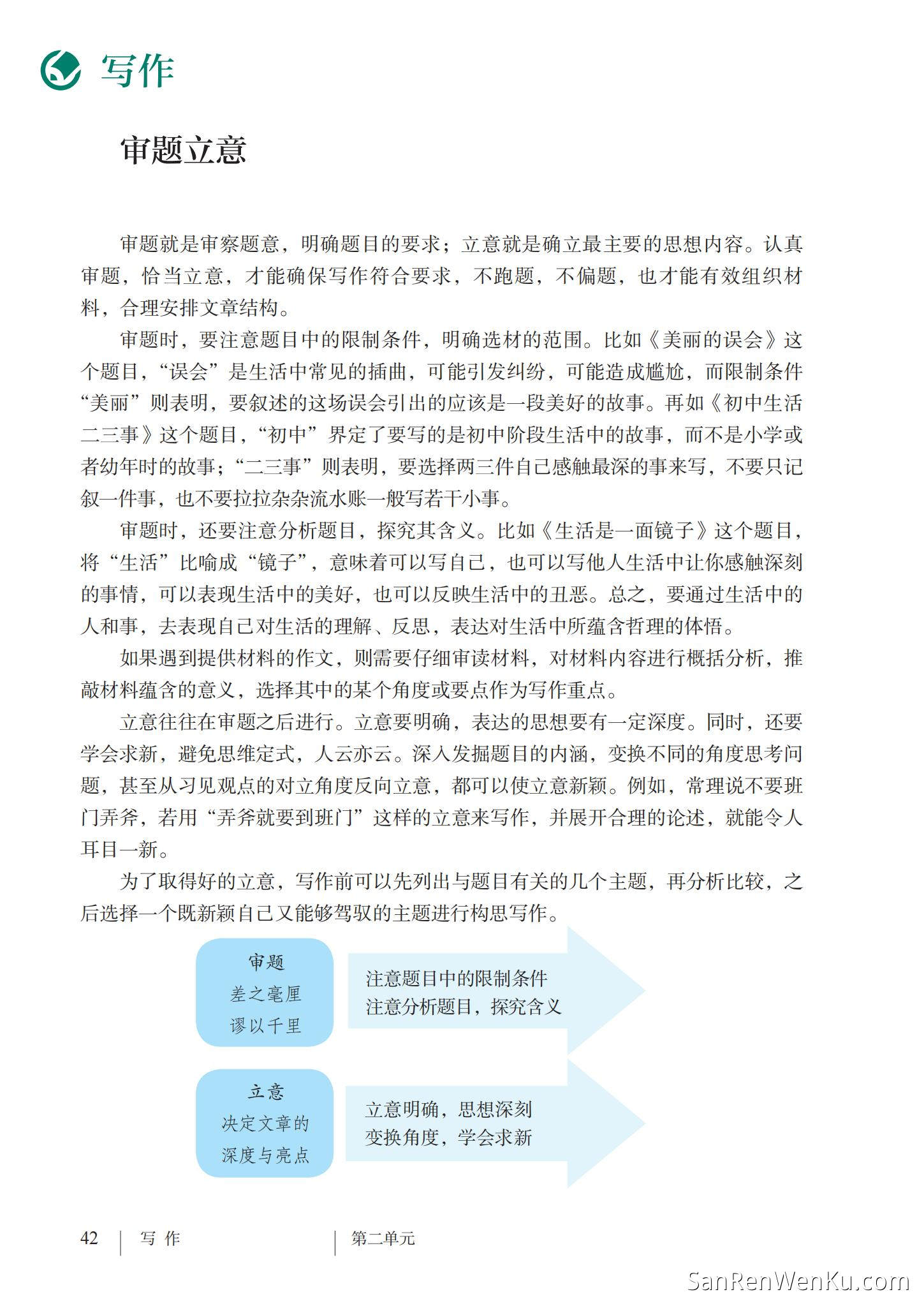 审题就是审察题意,明确题目的要求;立意就是确立最主要的思想内容。认真审题,恰当立意,才能确保写作符合要求,不跑题,不偏题,也才能有效组织材料,合理安排文章结构。