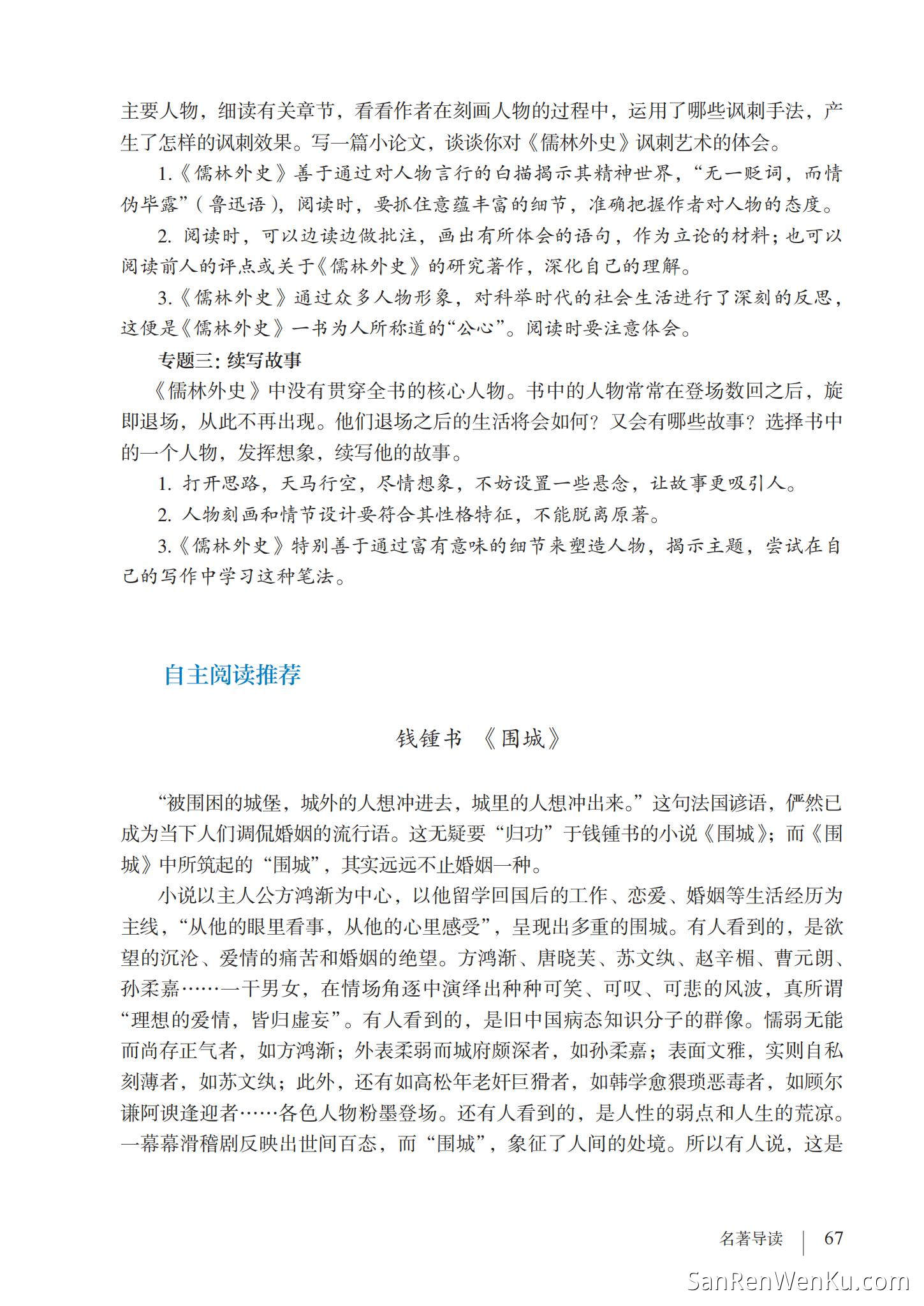 2.阅读时,可以边读边做批注,画出有所体会的语句,作为立论的材料;也可以阅读前人的评点或关于《儒林外史》的研究著作,深化自己的理解。